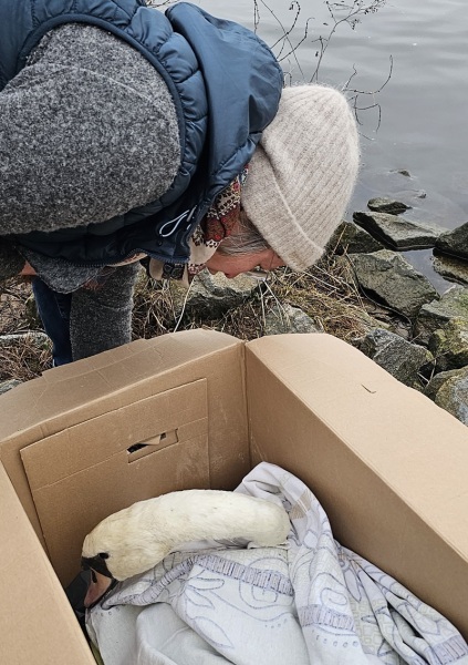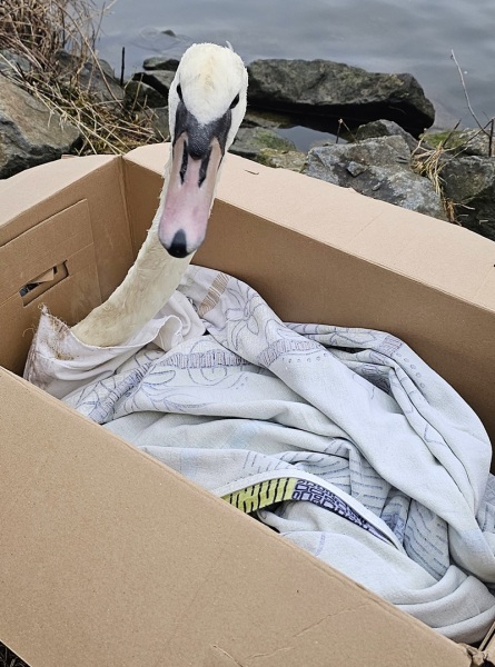 In der Annahme, dass es dem Schwan nun wieder gut geht, haben sie ihn wieder ans Wasser gebracht. Mussten aber ein paar Tage später feststellen, dass es ihm immer noch nicht gut ging, da er stark humpelnd aus dem Wasser kam. Daraufhin packten sie ihn wieder ein und brachten ihn zu uns ins Tierheim.