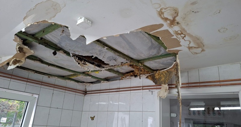 Dies betrifft das große Kleintierzimmer im hinteren Teil des Hauptgebäudes, dort zeigte sich eine feuchte Stelle an der Decke. Das nicht so schlimm aussehende Problem entpuppte sich aber als großes, denn das eingedrungene Regenwasser hat sich seinen Weg gesucht und das Dachgebälk faulen lassen. Das Zimmer musste sofort geräumt werden, da die Decke runterzukommen drohte. Das Leck wurde erstmal provisorisch geschlossen, was aber beim nahenden Winter und den bevorstehenden Regenfällen keine Dauerlösung sein kann.