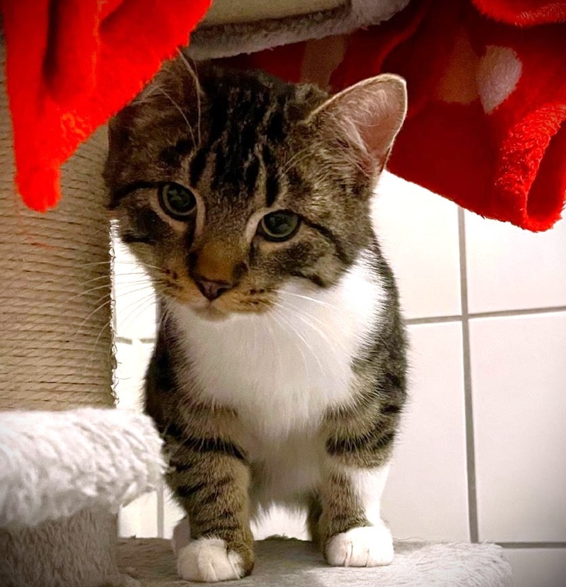 Die anfangs vorsichtige Alex ist ein Fundkätzchen und wohnt mit den ihren Brüdern Tommy und Jacky in einem Zimmer. Sie ist ist noch die Zurückhaltendste von den dreien. Typisch Mädchen schaut sie sich das Spielen erstmal an und kommt dann aber auch dazu. Sie ist aber sehr bestechlich mit gekochtem Hähnchen und wenn sie dabei ist, genießt sie streicheln und schnurrt ordentlich.