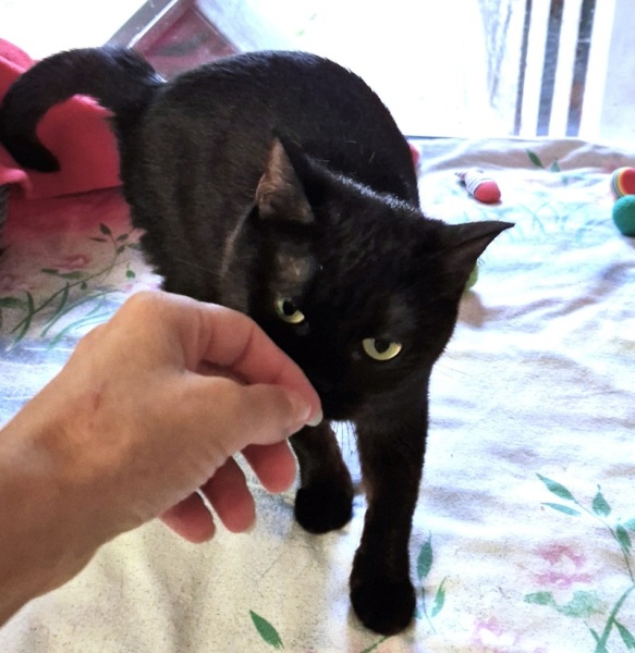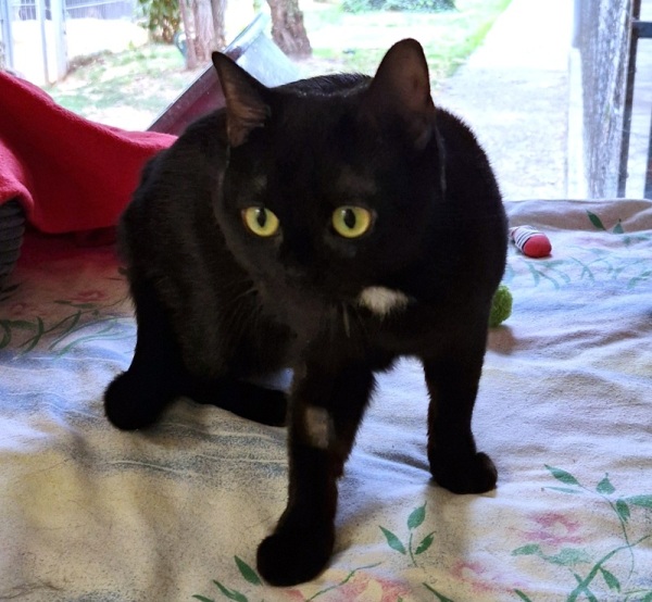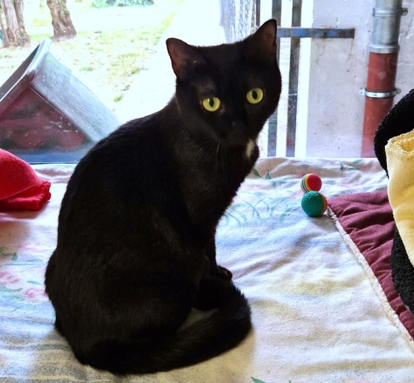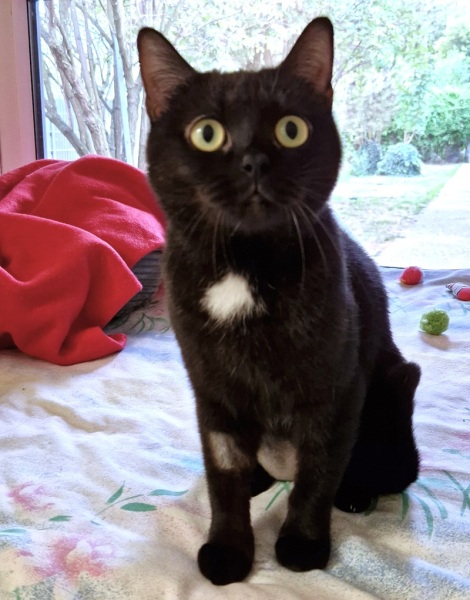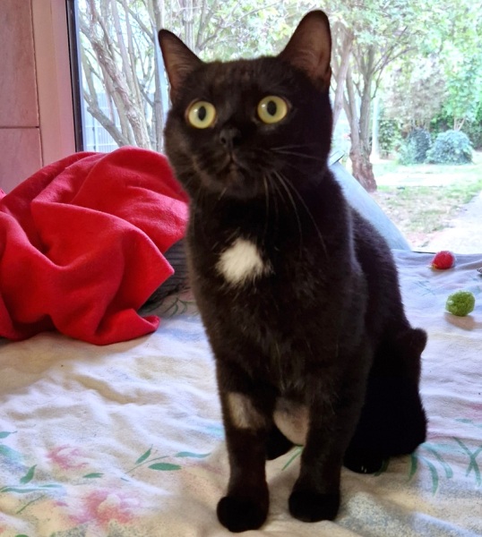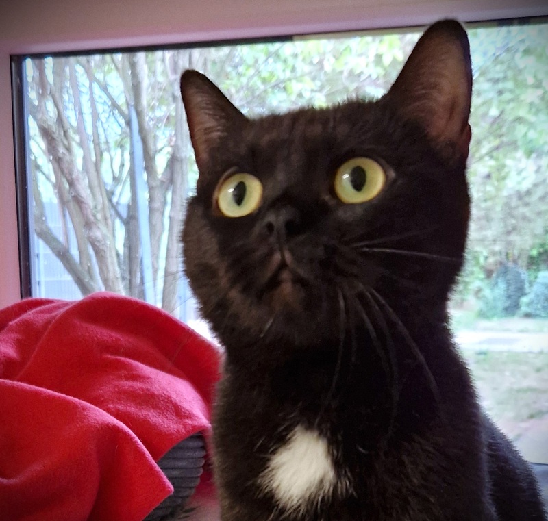 Rasse: BKH-Mix, schwarz mit weißem Fleck auf der Brust