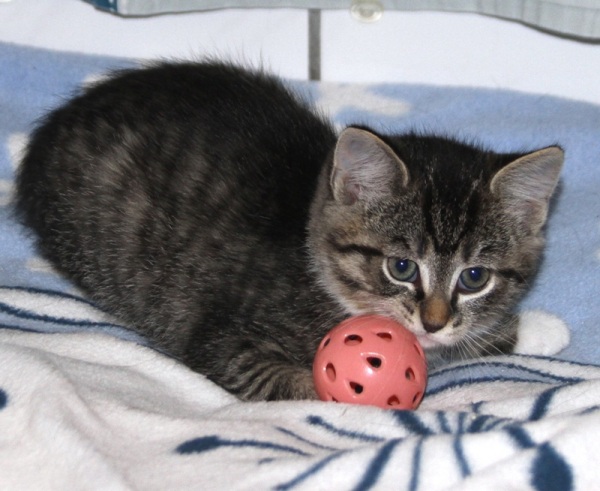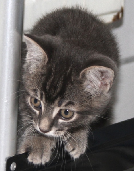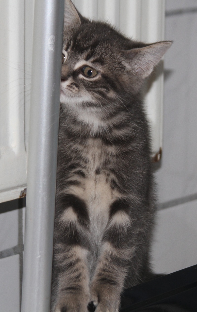 Nikos ist das einzige Katerchen von fünf Kitten (Iris, Gaia, Selena und Thea), die aus einem Gartencenter – mit ihrer Mama Hera zusammen – ins Tierheim gebracht wurden. Anfangs sah man die Unterschiede kaum, aber bei näherem Hinsehen sieht man, dass der kleine Nikos ein grau-schwarz marmoriertes Fell hat.