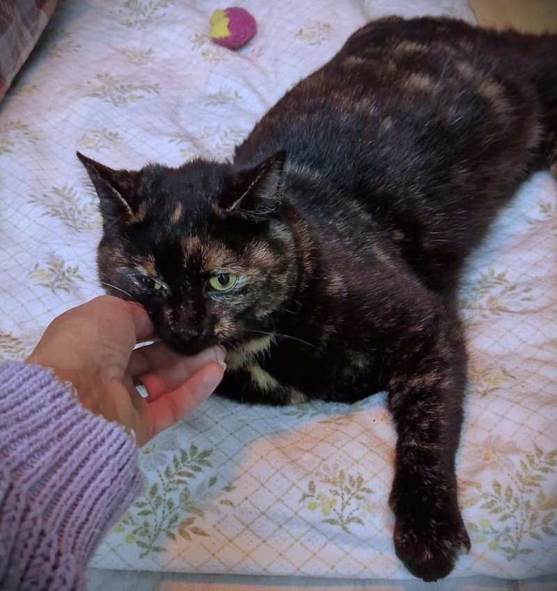 Paula ist eine liebe und anfangs etwas vorsichtige Schildpatt-Schönheit. Wir denken, dass sie evtl. ein BKH-EKH-Mix ist, denn sie hat ein wunderbar flauschiges Fell.