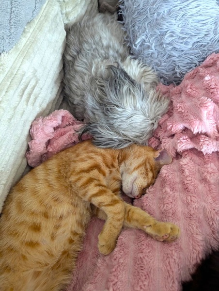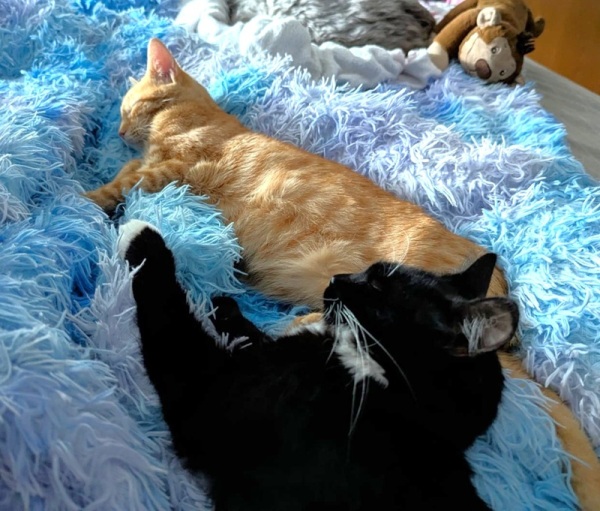 Er ist nicht ganz so menschbezogen wie Vicky, was sie auch zu einem idealen Paar macht, denn auf einem Schoß ist ja nicht unbedingt für 2 Platz. Trotzdem holt auch er sich seine Streicheleinheiten regelmäßig ab, aber eben nicht so häufig wie Vicky. Er versteht sich sehr gut mit dem Hund der Pflegestelle und wird auch oft dabei gesehen, dass er mit ihm im Hundebett liegt und kuschelt, was er natürlich auch mit Vicky macht.